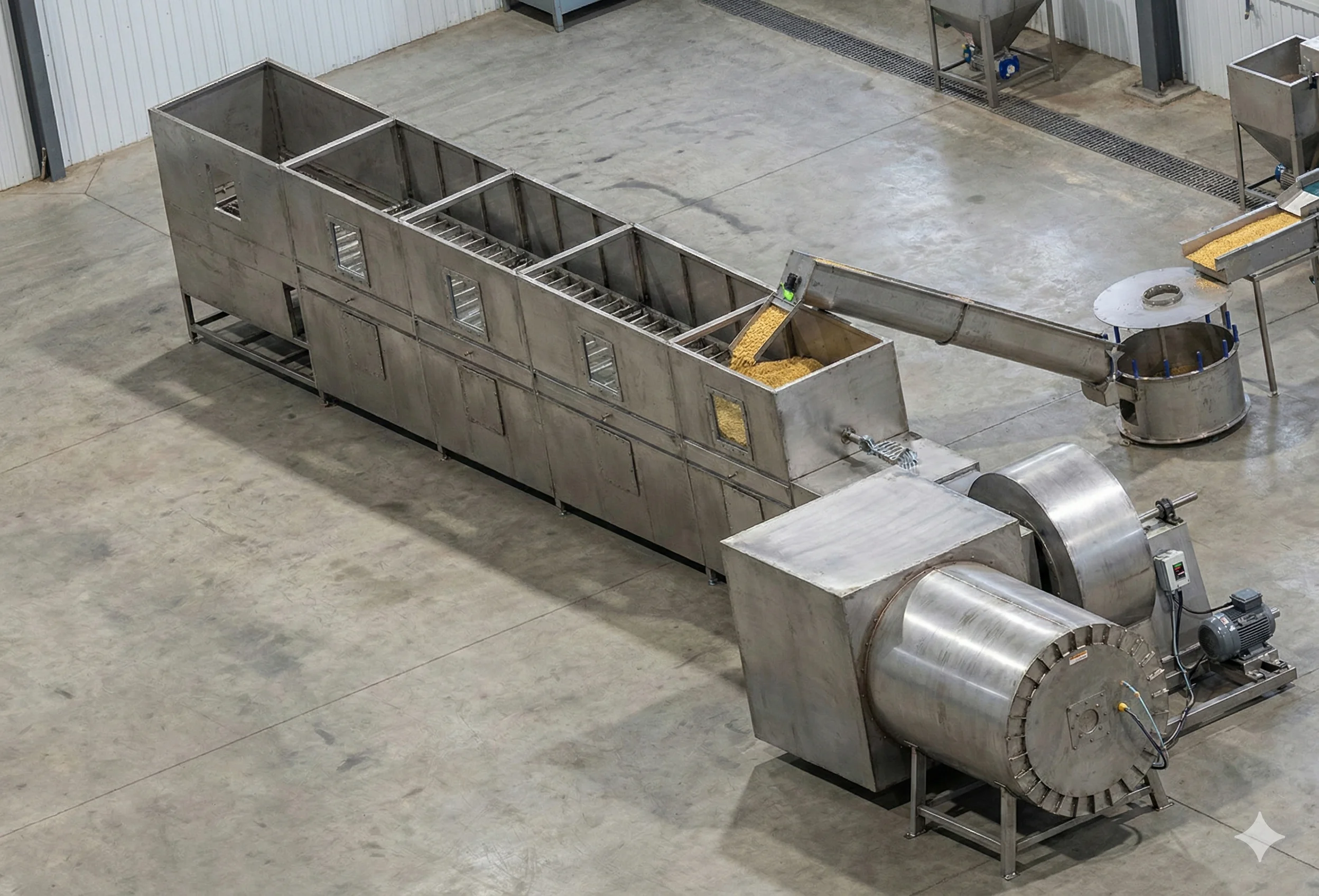 Endüstriyel ölçekli susam işleme tesisleri için tasarlanan 10 Metre Yatay Akışkanlı Kurutma Fırınımız, hızı, verimliliği ve kaliteyi bir araya getirir. Saatte 1 ton susam işlemek üzere mühendislik harikası olarak geliştirilen bu sistem, tohumların doğal lezzetini, rengini ve yağ oranını korurken homojen bir kuruma sağlar.
